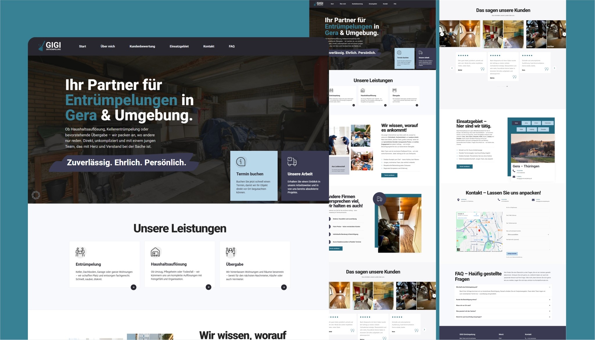 Wir entwickelten eine kompakte, informierende Website mit Fokus auf Klarheit und Service: Übersichtliche Darstellung der Leistungen Entrümpelung, Haushaltsauflösung, Messieräume etc., Abschnitt mit echten Kundenbewertungen zur Vertrauensstärkung und prägnante Call‑to‑Action-Elemente. Bilder aus aktuellen Einsätzen unterstreichen Professionalität und regionale Verwurzelung.