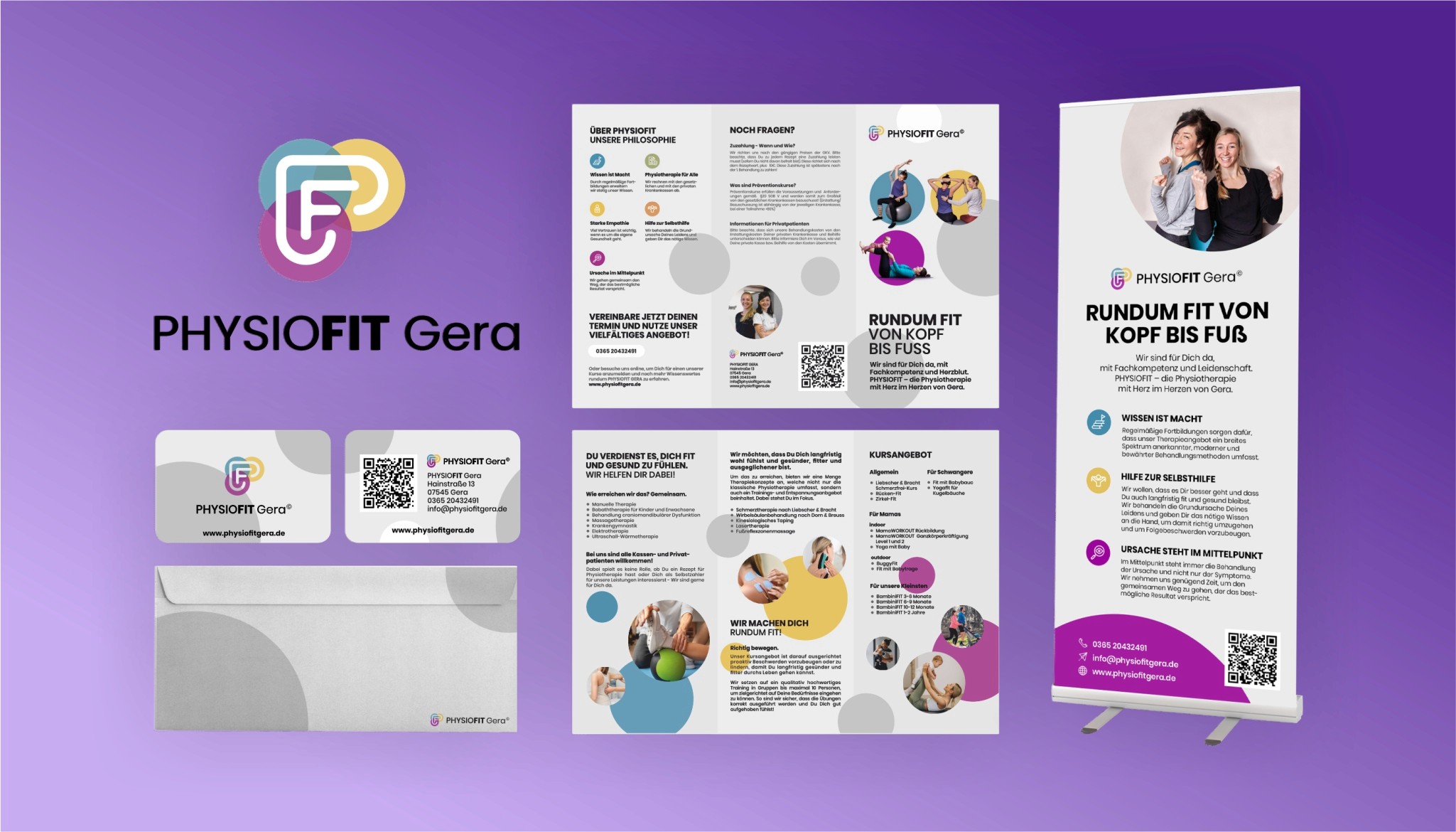 In enger Zusammenarbeit mit dem Team von PhysioFit Gera entwickelten wir eine komplett neue Markenidentität. Beginnend mit der Namensfindung entstand ein klares, modernes und sympathisches Markenkonzept. Farben, Typografie und Bildwelt wurden so gewählt, dass sie Wärme, Vertrauen und Gesundheitskompetenz vermitteln. Das Logo greift diese Werte visuell auf, stellt die 3 Bereiche der Praxis dar und bildet zusammen mit der Geschäftsausstattung, Außenwerbung und verschiedenen Printmaterialien ein konsistentes Erscheinungsbild – von der Visitenkarte bis zur Praxisbeschilderung.