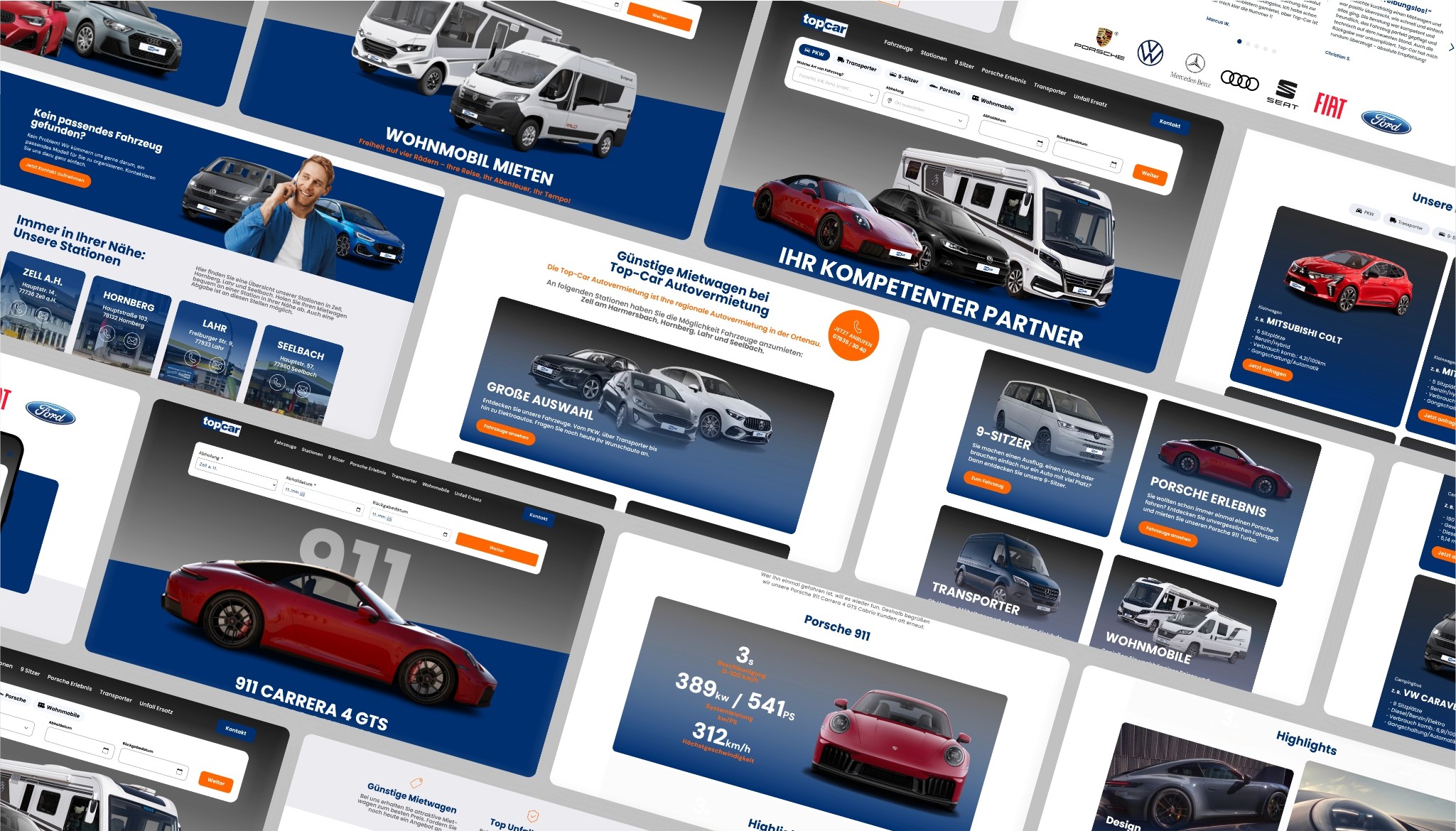 In enger Zusammenarbeit mit Top‑Car entstand ein übersichtlicher Webauftritt mit klaren Fahrzeugkategorien (z. B. Transporter, 9‑Sitzer, Wohnmobile, Porsche‑Erlebnisse). Jeder Bereich ist übersichtlich gestaltet, mit prägnanten Bildern, kurzen Leistungsbeschreibungen und direkten Call‑to‑Action Buttons. Ansprechende Fotos sorgen für Nähe und Vertrauen, während die Stationsübersicht den regionalen Fokus unterstreicht .